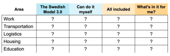 Once the two critical uncertainties are selected, explore what each quadrant means for the landscape in which you aim to succeed. This is done by formulating scenario building blocks: brief explanations of what how scenario is expressed in different areas, such as work, workplaces, mobility, logistics, finance, spare time, education, public agencies, government, food systems, and more (tailored to your domain). For each scenario, ask: What does this imply for each area? A simple table is often enough to capture these scenario building blocks.