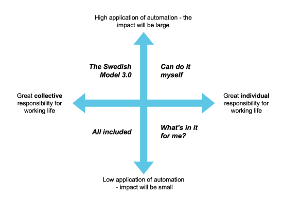 The Swedish Work Environment Authority sought to prepare for the future up to 2035. After a couple of hours discussing trends and uncertainties, the team identified the two expected to have the greatest impact on Swedish working life. After completing the steps described below, the four scenarios were named to reflect their main characteristics.