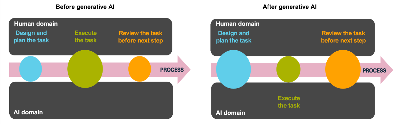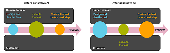 Figure 1: “A model of the shift of the central steps in a typical process. With generative AI, more tasks can increasingly be carried out by AI, which raises the importance of good planning, process design, and quality assurance by the knowledge worker. The size of the circles symbolizes how much time is spent on each step compared with the others.”