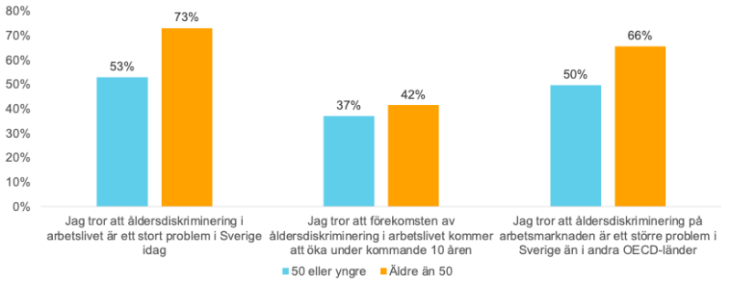 Åldersdiskriminering i arbetslivet anses vara ett stort problem, föga förvånande främst bland de äldre. Dessutom tror många av de som besvarat enkäten att åldersdiskriminering är ett särskilt svenskt problem, jämfört med i andra OECD-länder.