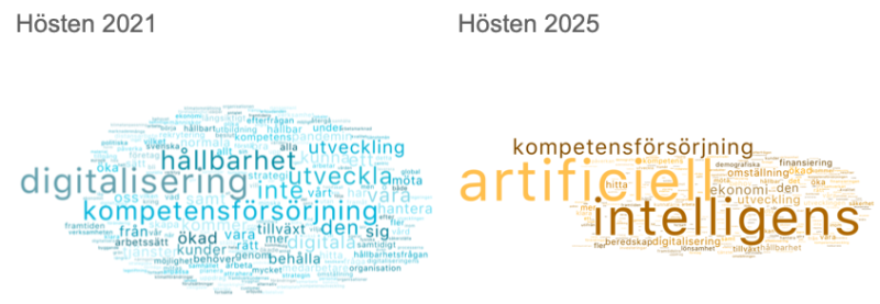 När det gäller vilken som är den viktigaste strategiska framtidsfrågan just nu har det skett betydande förändringar de senaste åren. Under hösten 2021 var frågor relaterade till digitalisering och hållbarhet vanligt nämnda. Fyra år senare verkar hållbarhetsfrågor halkat ned på ledningarnas agendor, och digitaliseringsfrågor ersatts med AI-frågor. Konstant i sammanhanget är kompetensförsörjning som viktig strategisk framtidsfråga såväl hösten 2021 som hösten 2025.