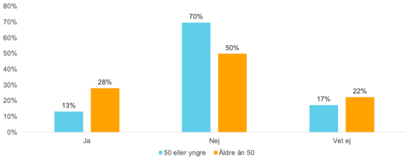 Figur 3. Svar på frågan: ”Har du upplevt att du blivit åldersdiskriminerad i samband med att du sökt ett nytt jobb?”