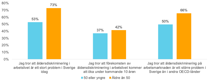 Åldersdiskriminering i arbetslivet anses vara ett stort problem, föga förvånande främst bland de äldre. Dessutom tror många av de som besvarat enkäten att åldersdiskriminering är ett särskilt svenskt problem, jämfört med i andra OECD-länder.