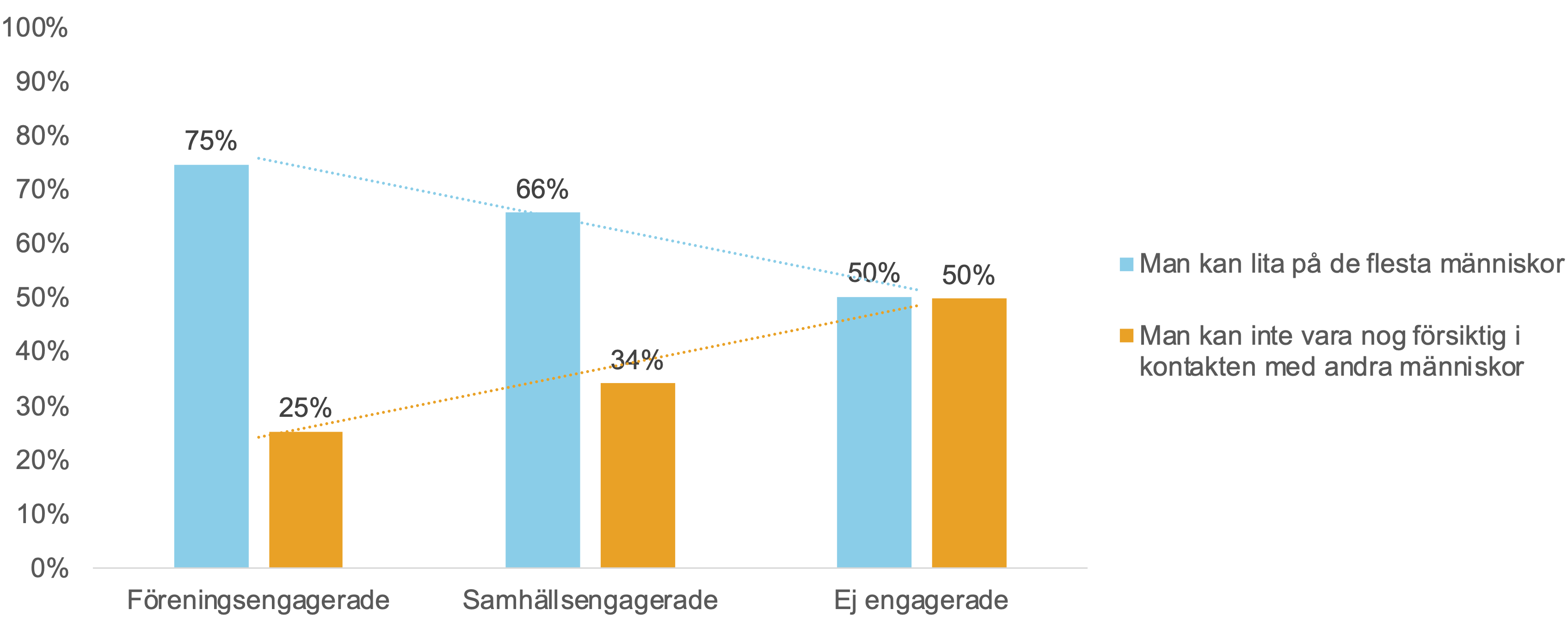 Drygt 1000 svenskars svar på frågan Allmänt sett, tycker du att man kan lita på de flesta människor, eller att man inte kan vara nog försiktig i kontakten med andra människor?. Svaren fördelade på studiens tre engagemangspersonas.