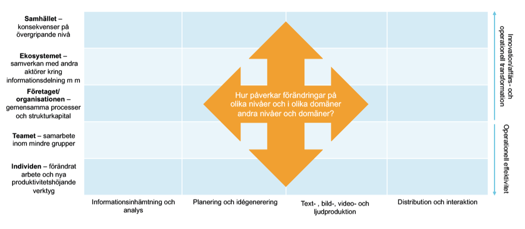 Lösningar baserade på generella språkmodeller som GPT3 har potential att förändra informations- och kunskapsarbetet längs hela kedjan från informationsinsamling och analys till kommunikation och interaktion med till exempel kunder. De förändrar också former för samarbete inom team, och öppnar nya möjligheter och ställer nya krav på organisering och hantering av strukturkapital, samt samverkan med externa aktörer.
