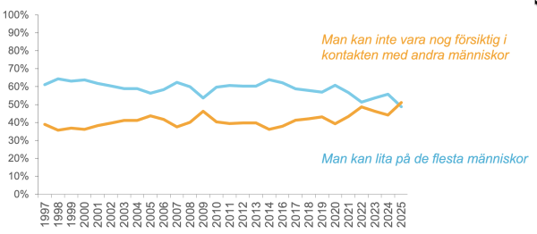 Tillitsutvecklingen bland svenska 16-29åringar, linjerna visar hur stor andel av åldersgruppen som svarat jakande på de två alternativen. Frågan är ställd med endast dessa två alternativ. 2025 blev andelen som anser att "man kan inte vara nog försiktig i kontakten med andra" i majoritet. Källa: Kairos Future.