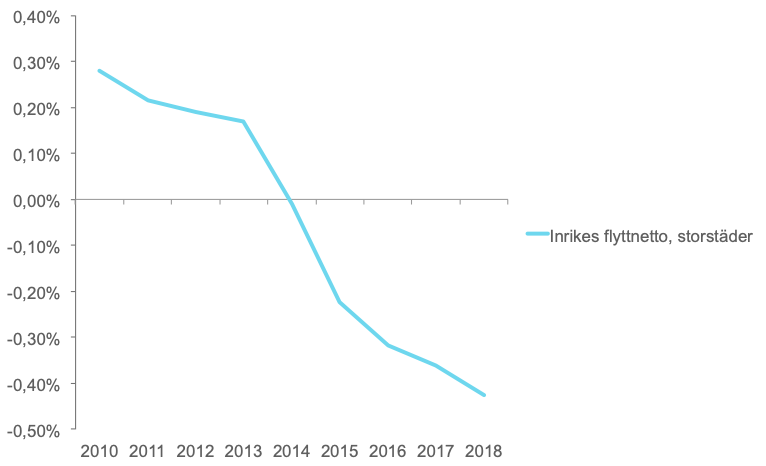 Tittar vi på hur siffrorna ser ut, framförallt de senaste åren, kan vi dock konstatera att flyttandet inom landet leder till att storstäderna tappar folk. Detta har varit fallet i såväl Stockholms stad, Göteborgs stad som Malmö stad de senaste åren.